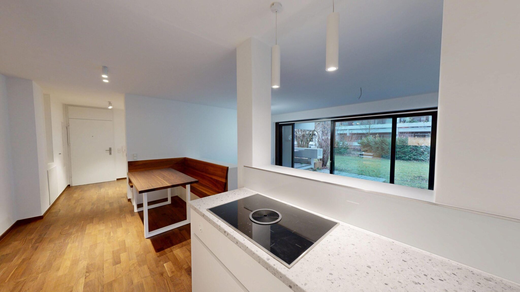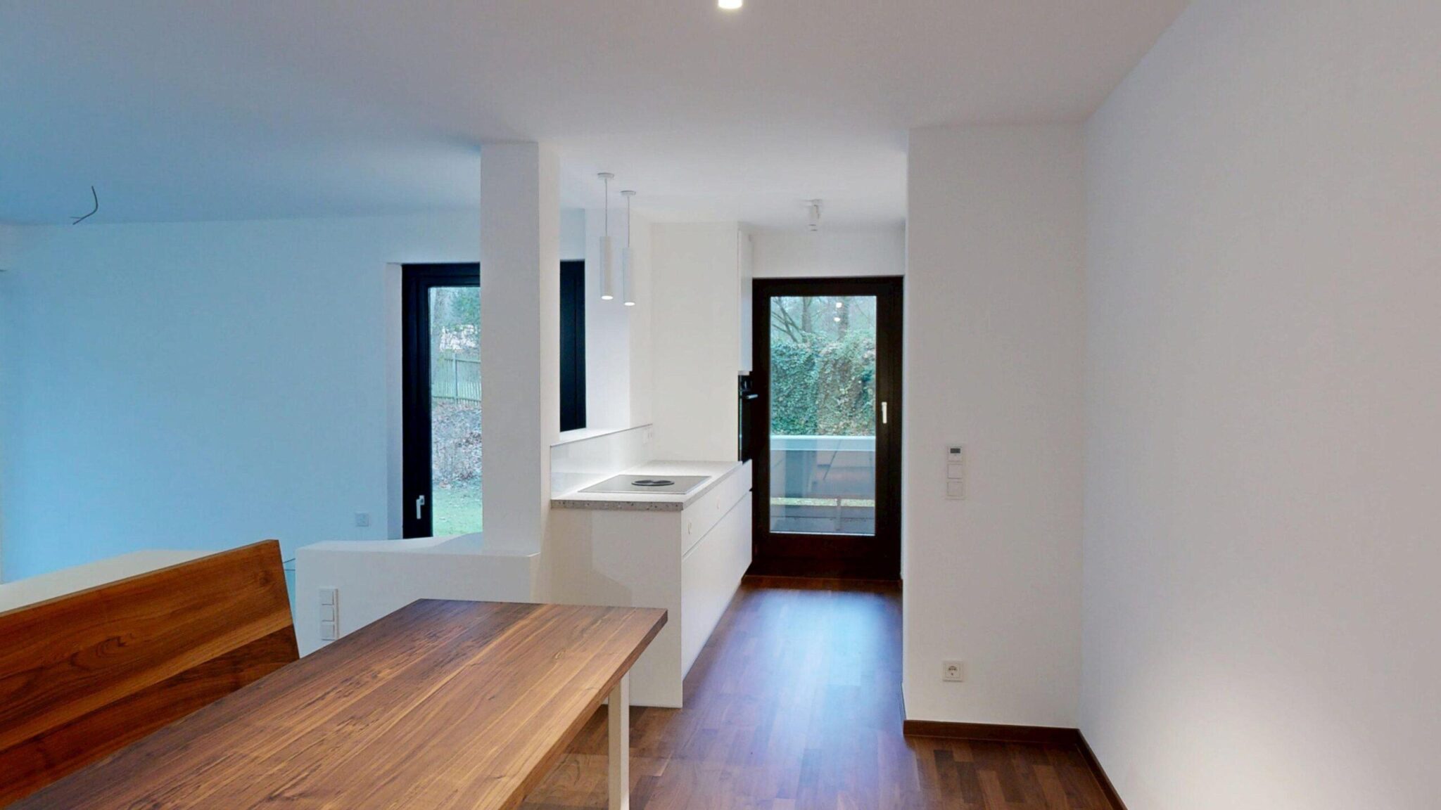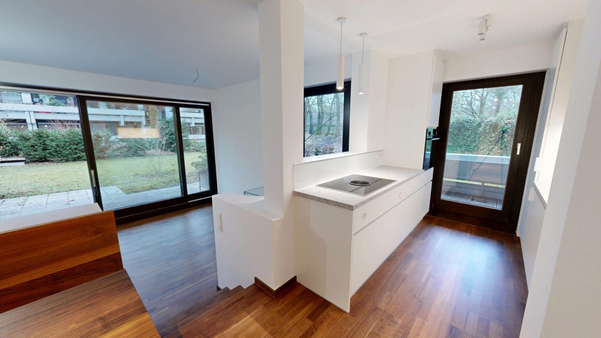 Im Erdgeschoss befinden sich ein offen gestalteter Wohn-, Ess- und Küchenbereich mit hochwertiger Einbauküche (Siemens-Geräte, Bora-Kochfeld), ein Wohnzimmer mit großer Fensterfront, hohen Decken und Zugang zur Terrasse und zum Garten sowie zwei Schlafzimmer mit Terrassenzugang und ein modernes Bad mit Badewanne.