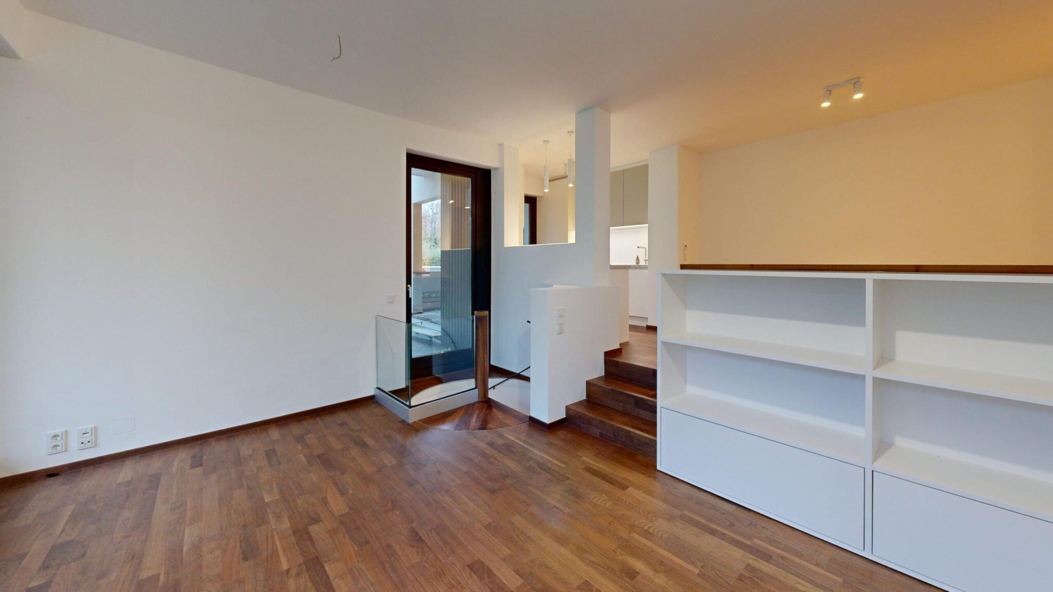 Diese moderne Maisonettewohnung erstreckt sich über Erd- und Untergeschoss und ist durch eine elegante Wendeltreppe verbunden. Hochwertiges Echtholzparkett wurde in der gesamten Wohnung verlegt.