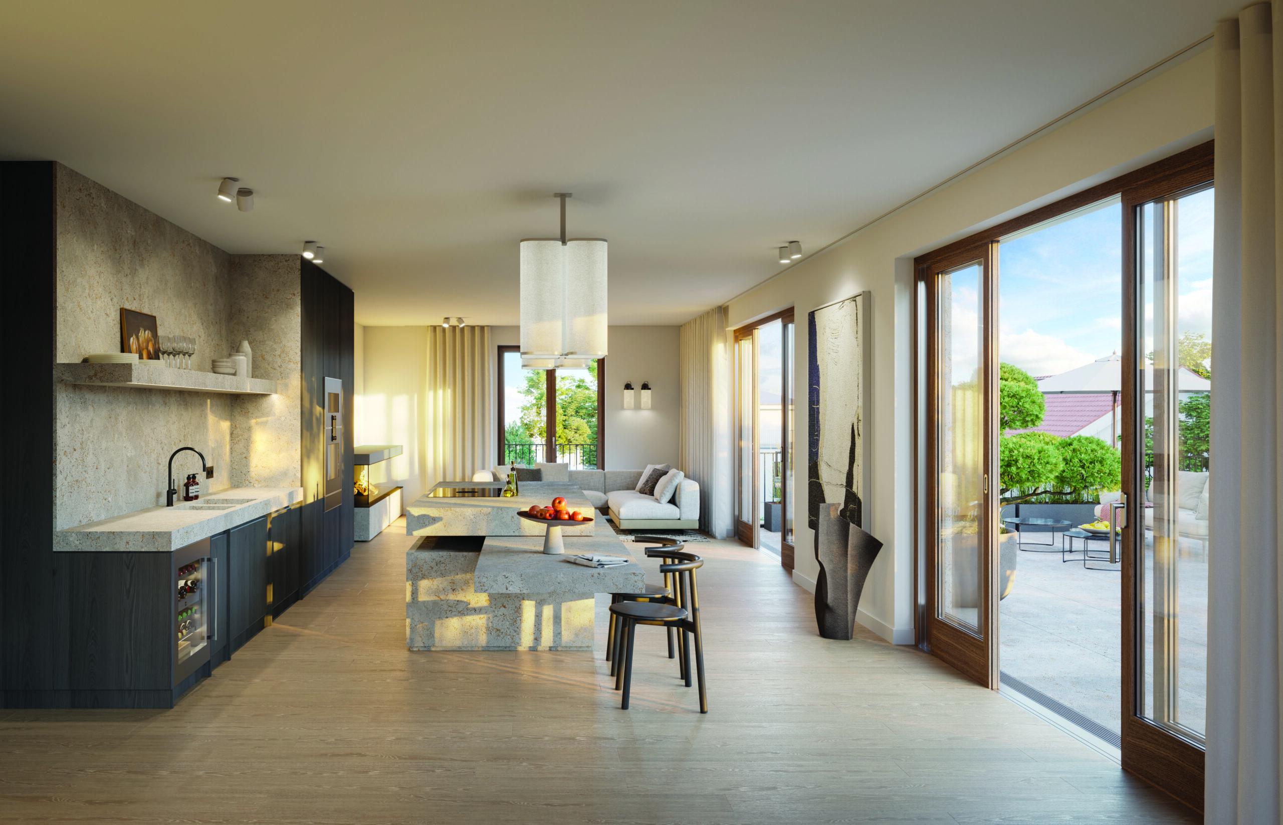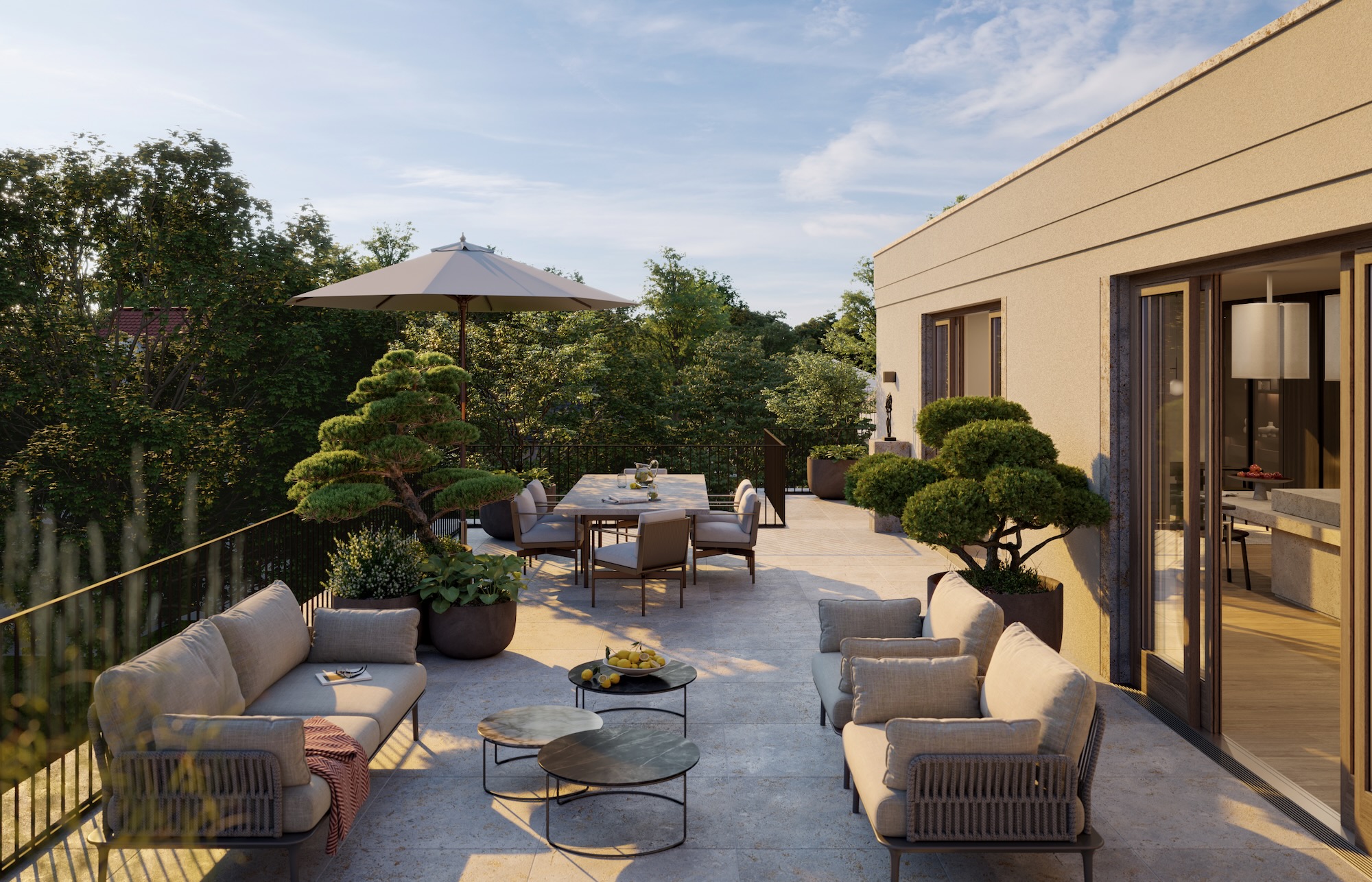 Drei Terrassen – darunter eine beeindruckende Südterrasse mit ca. 83 m² – eröffnen herrliche Ausblicke über den Herzogpark und lassen Innen- und Außenräume harmonisch verschmelzen.